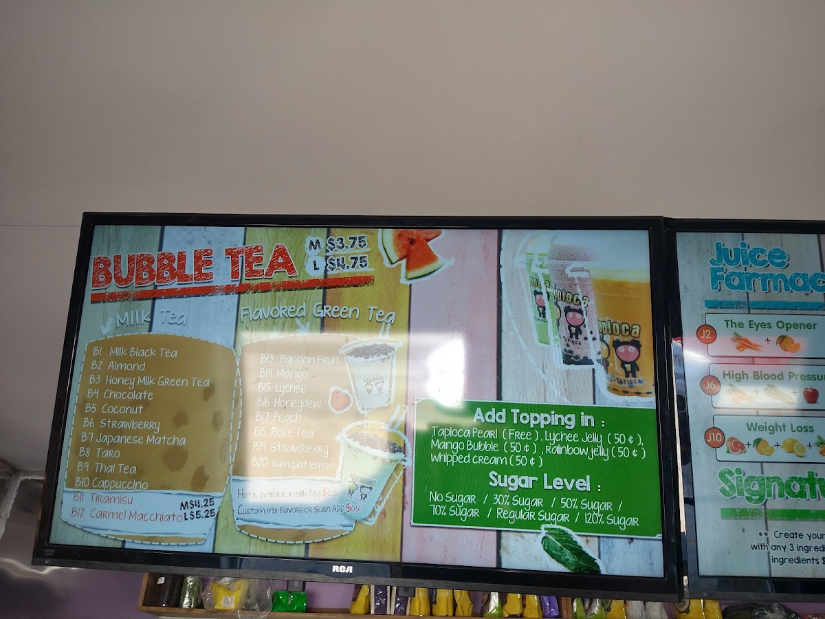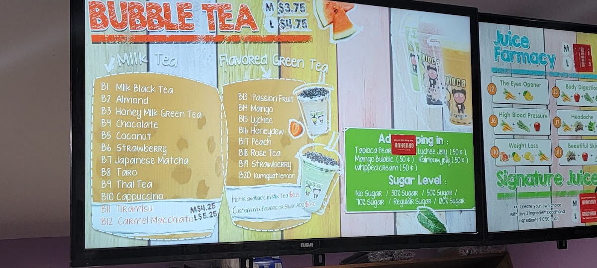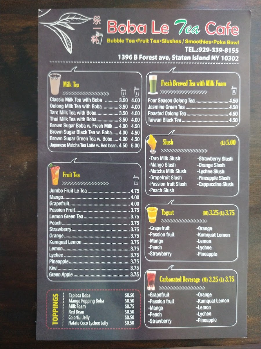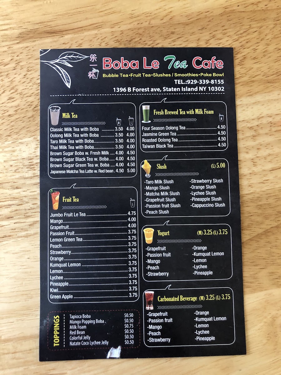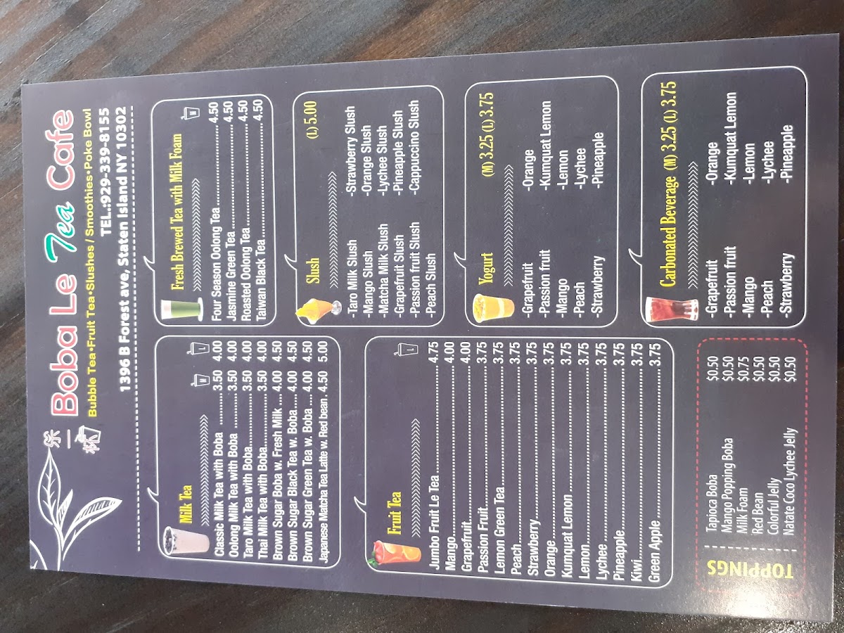Boba Le Tea Cafe offers a diverse menu perfect for any taste. Their Tropical Smoothies are a refreshing choice, with options like the VC Party Smoothie and Mango Sunrise Smoothie priced at $6.99 each. For a more organic option, their Acai Smoothies include the Amazing Acai Smoothie and Health Booster Smoothie, each priced at $7.99. If you're looking for something to support your health, their Juice Farmacy offers blends such as the Brain Power Juice and Allergy Juice for $5.99. The cafe also has a collection of Signature Juices like the Vitality Green Juice for $6.50, or you can Create Your Own Juice for a customized experience. For those who enjoy milk tea, the Black Milk Tea With Boba and Brown Sugar Boba With Fresh Milk Tea at $5.99 are standout choices. The Jumbo Fruit Le Tea and Mango Tea from their Fruit Tea menu are perfect for fruit lovers, priced at $5.49. Additionally, the Roasted Oolong Tea and Taiwan Black Tea from the Fresh Brewed Tea with Milk Foam selection provide a unique, smooth option for tea enthusiasts. For something icy, the Taro Milk Slush and Matcha Milk Slush at $5.49 offer a cool, creamy delight. The Mango Yogurt and Strawberry Yogurt options cater to those who prefer a fruity, tangy treat. Finally, the Butterfly Pea Tea Series introduces fun, colorful options like Virgo and Capricorn, priced at $6.99. With such a wide variety of beverages, Boba Le Tea Cafe provides something for everyone, whether you’re craving a refreshing smoothie, tea, or a creamy slush.